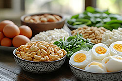 Food sources of Phenylalanine, in addition to protein, include cheese, soybeans, sesame seeds, almonds and peanuts.