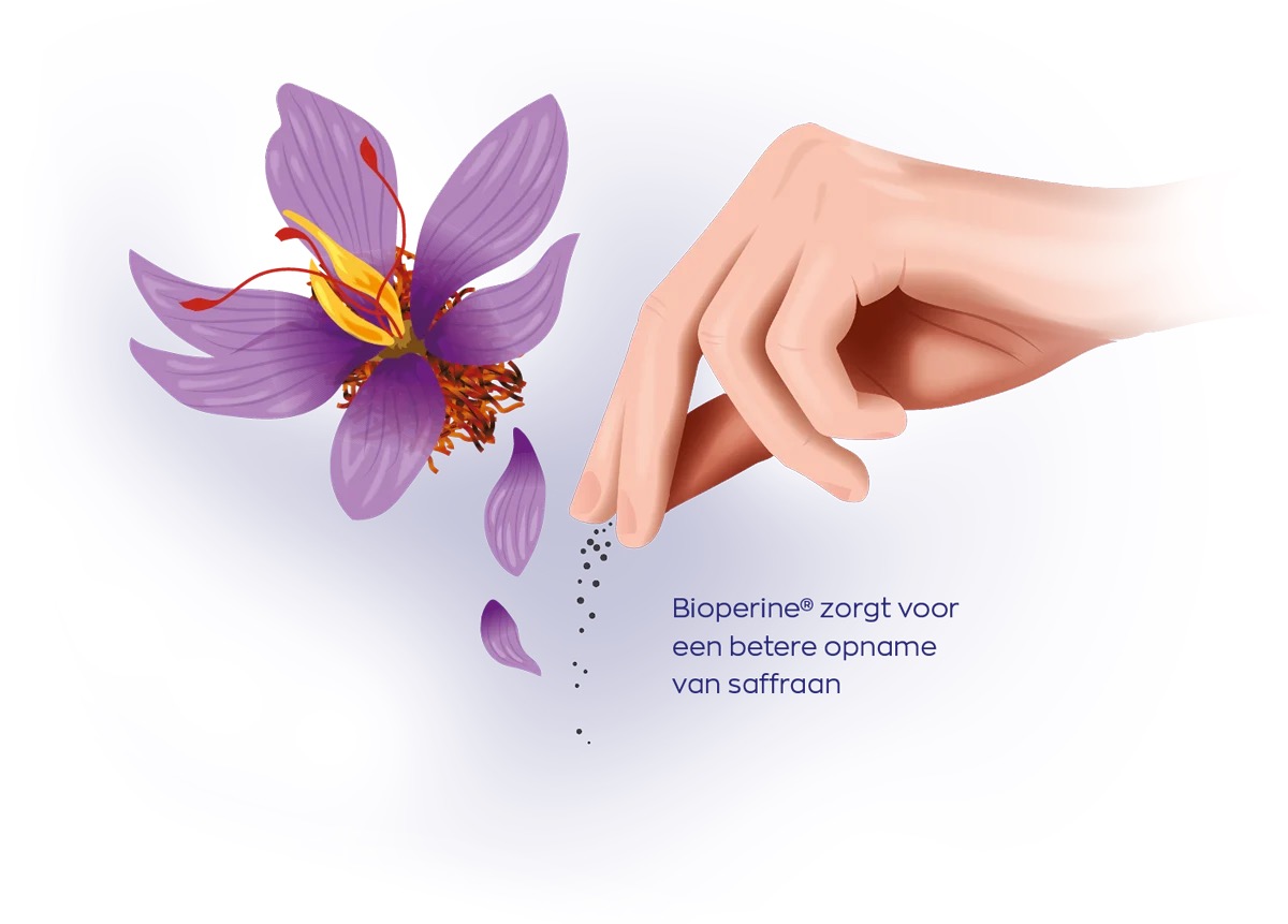 In this formula, saffron is combined with the patented Bioperine®. This is an extract of black pepper that consists of as much as 95-98% piperine, the main active ingredient. The high-quality Bioperine® has been clinically tested, proving its quality scientifically. The main reason for adding this high-quality black pepper extract is because research shows it improves the absorption of other herbal extracts.