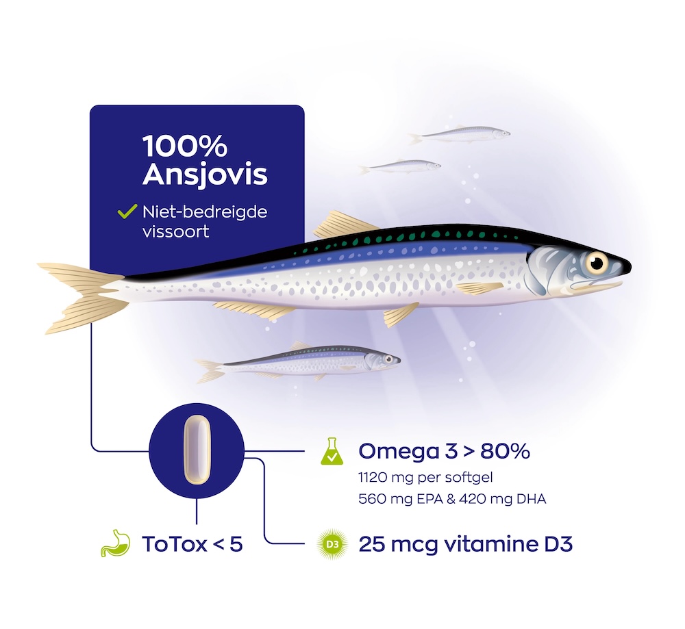 Many people in the Netherlands eat little fatty fish. Research shows that most people do not reach the recommended intake of omega 3 fatty acids EPA and DHA. The body cannot produce these essential fatty acids itself. EPA and DHA support heart function, help maintain healthy blood pressure, and support healthy triglyceride levels. These fatty acids also support the retina and help maintain normal vision. Visolie 1400 capsules provide 1,120 mg omega 3 per serving, including 560 mg EPA and 420 mg DHA.