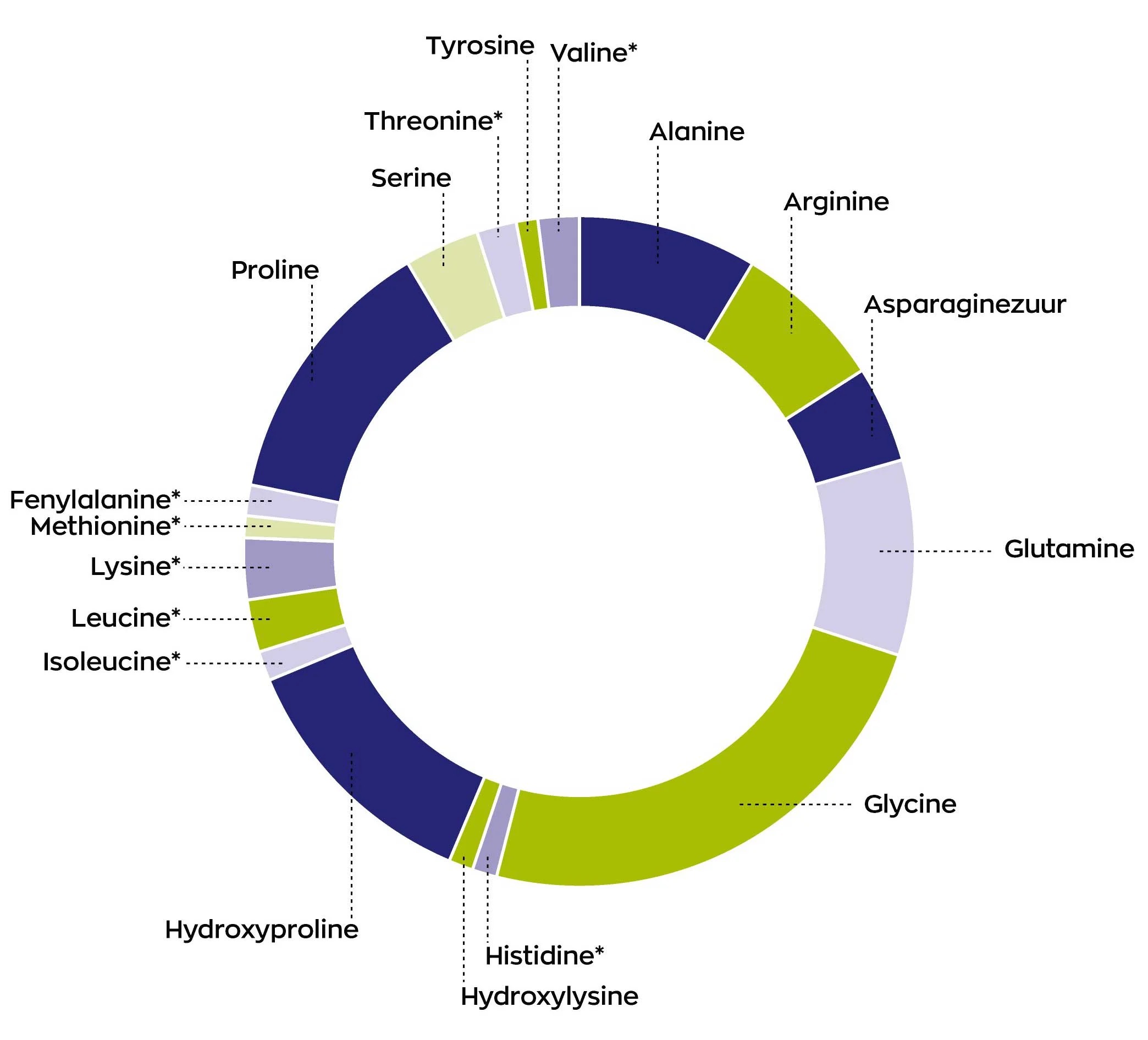 Eiwit bestaat uit aminozuren. In totaal zijn er 22 aminozuren. Collageen bevat 18 aminozuren. Proline, glycine en hydroxyproline vormen samen ongeveer 55% van de samenstelling.