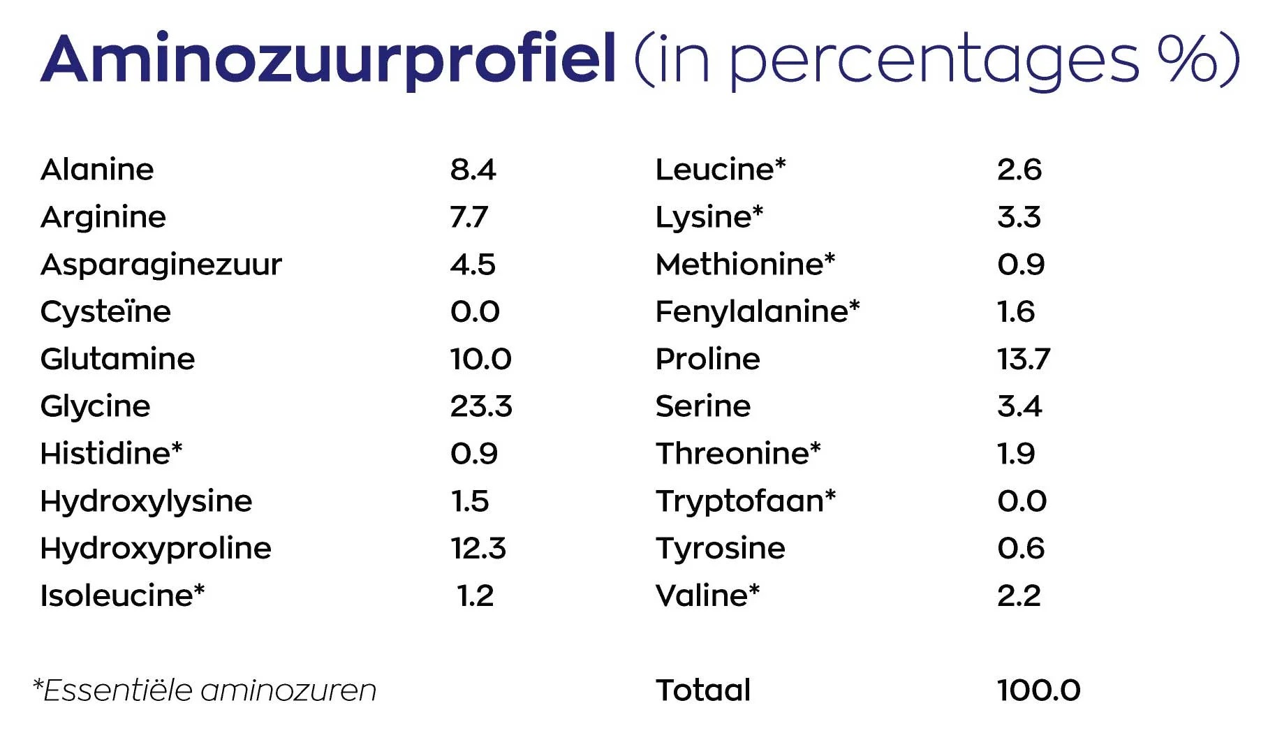 Dit collageenpoeder is een bron van puur eiwit en heeft een sterk aminozuurprofiel. Glycine en proline zijn ruim aanwezig. De peptiden zijn ook rijk aan hydroxyproline, wat typisch is voor collageen. Het product bevat daarnaast 8 van de 9 essentiële aminozuren die het lichaam uit voeding nodig heeft.