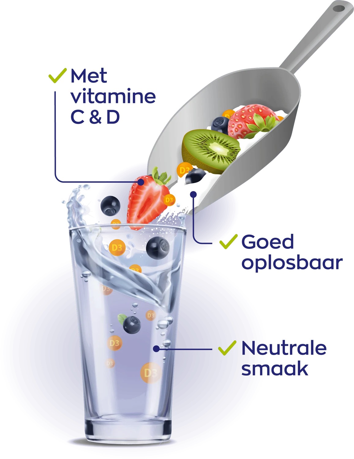 Vitamine D ondersteunt de normale opname en het normale gebruik van calcium. Dit helpt bij het behoud van normale botten. Vitamine D ondersteunt ook het behoud van normale tanden.