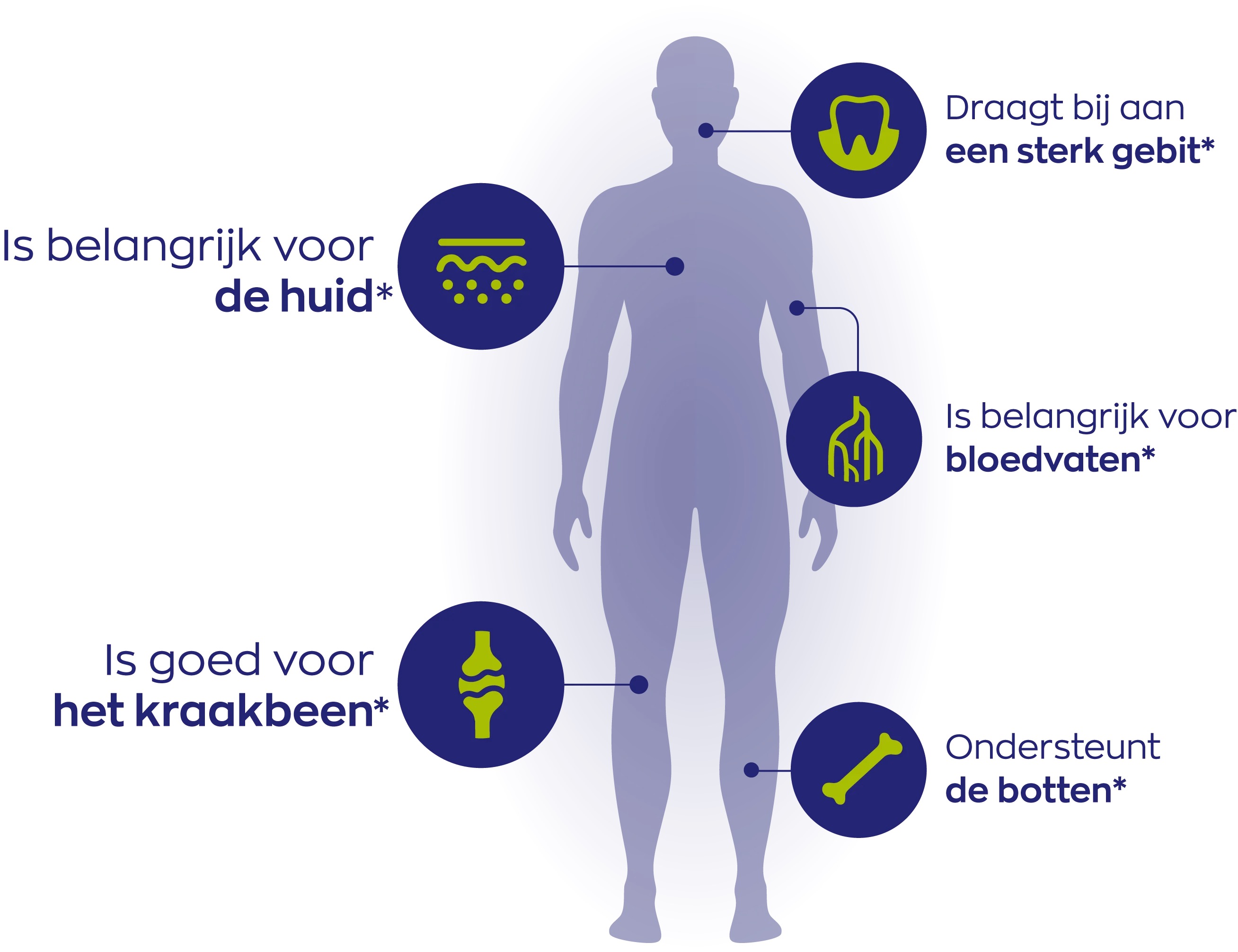 Vitamine C is toegevoegd om Collageen Solugel® te ondersteunen. Vitamine C draagt bij aan de normale collageenvorming voor de normale werking van de huid. Vitamine C ondersteunt ook de normale vorming van kraakbeen en het behoud van normale botten. Daarnaast ondersteunt Vitamine C gezond tandvlees en het ondersteunt de normale werking van bloedvaten.