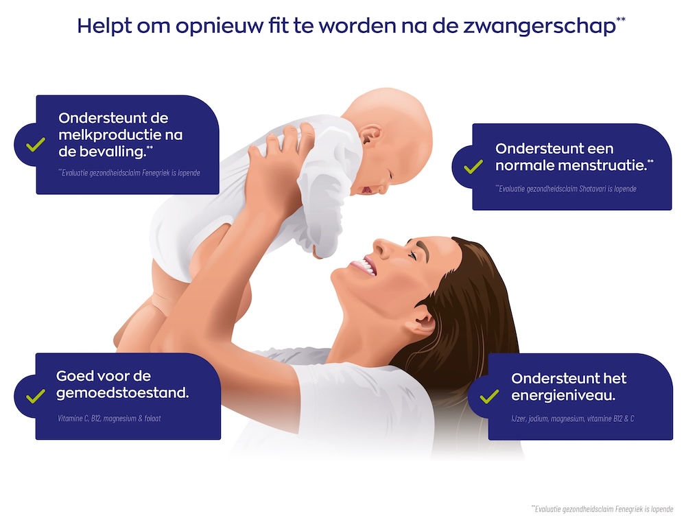 Vitamine C, vitamine B12, magnesium, folaat en ijzer ondersteunen de energiestofwisseling en helpen vermoeidheid verminderen. Folaat, vitamine B12 en ijzer ondersteunen bovendien de aanmaak van rode bloedcellen na de bevalling.