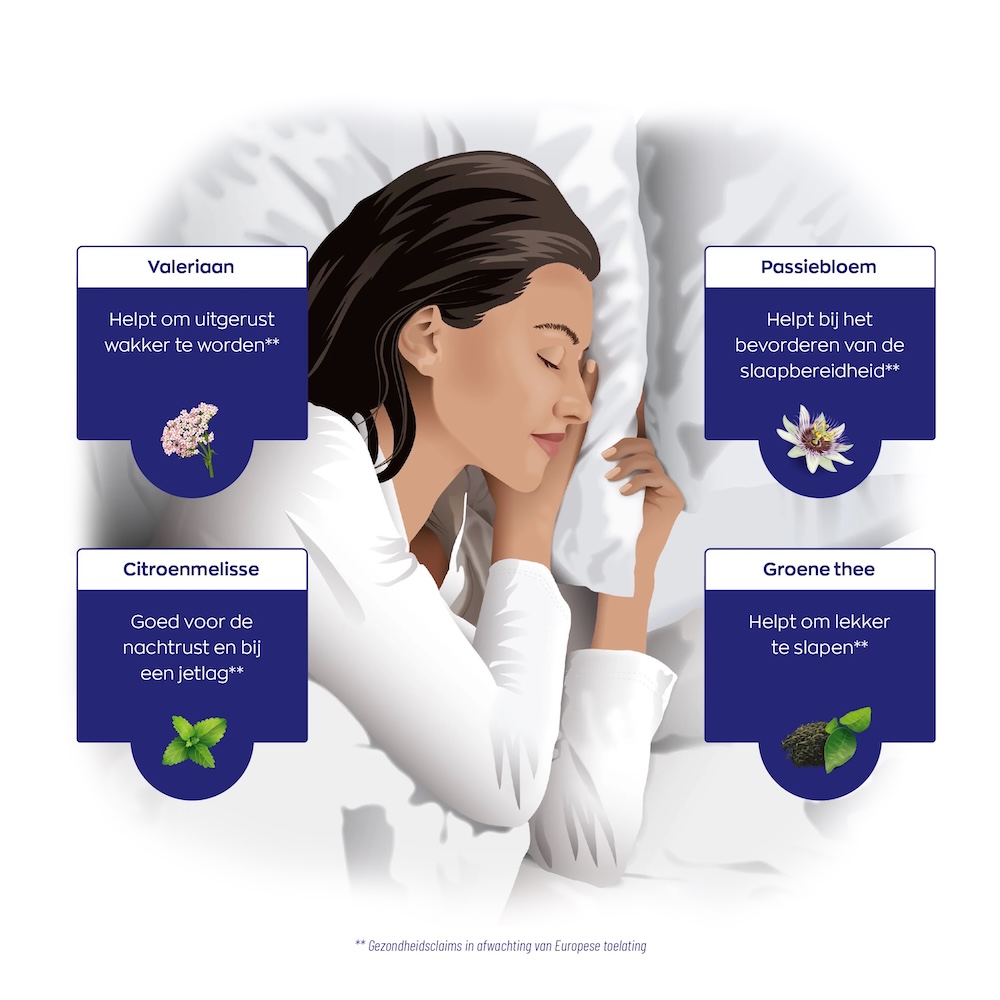 Valeriaan, passiebloem, citroenmelisse en groene thee vormen het hart van SlaapComplex. In spannende tijden en tijdens drukke werkzaamheden helpen zij lichaam en geest te ontspannen.** Deze natuurlijke rustgevers ondersteunen de nachtrust, helpen bij snurken en kunnen worden ingezet bij een jetlag.**