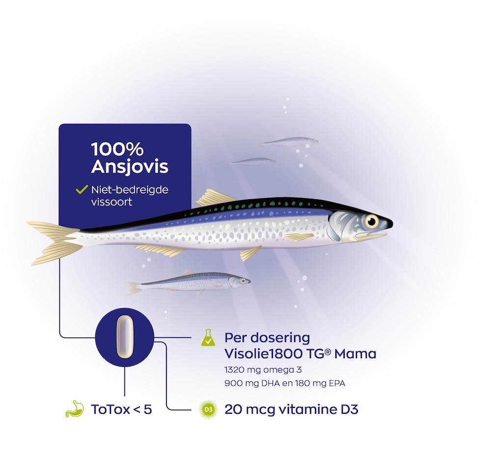 Tijdens deze periode is vooral het omega-3 vetzuur DHA van belang en daarom bevat Visolie 1800 TG® Mama meer DHA dan EPA.